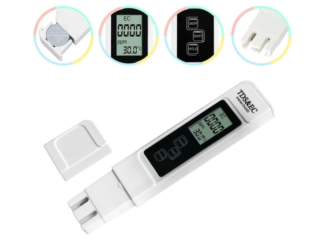 - Funkciók: TDS (Összes oldott szilárdanyag), EC (Vízvezetőképesség)