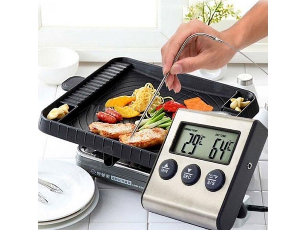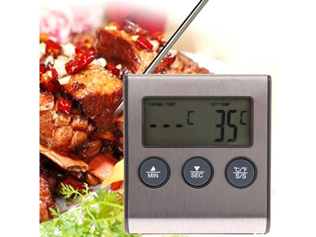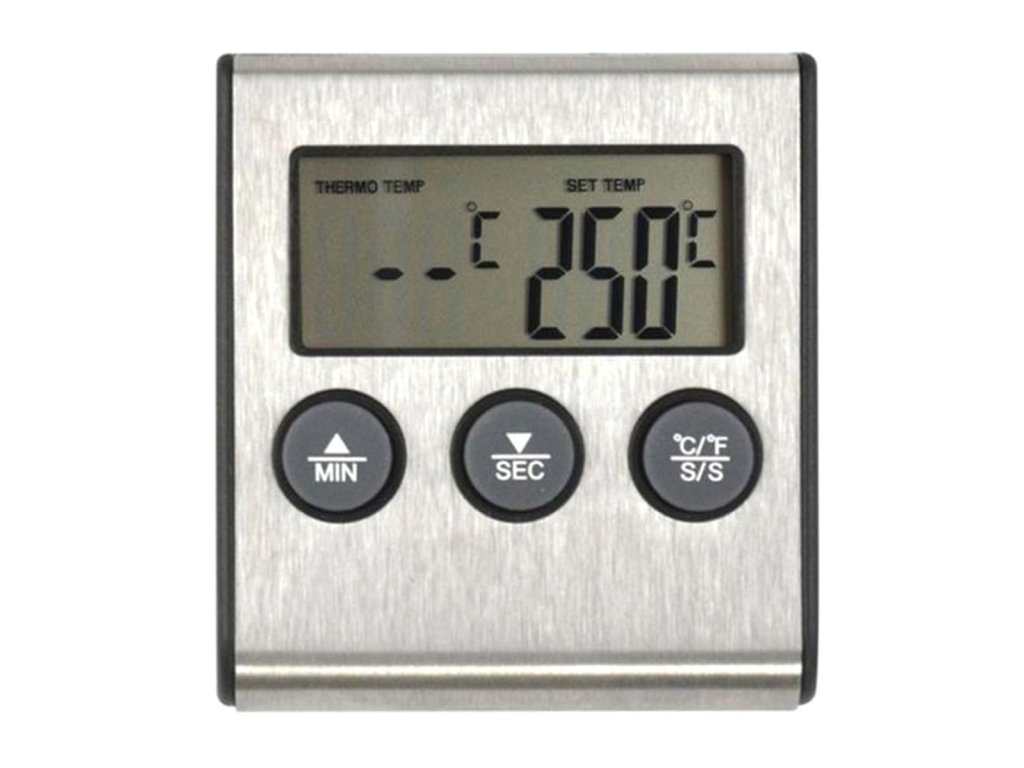 Elektronikus hőmérő hőálló szondával. Kiválóan alkalmas grillen, füstölőben, gáz- és elektromos sütők hőmérsékletének mérésére. Szükséges, ha a sütő nem rendelkezik beépített hőmérsékletjelzővel. A készülék átlátszó LCD kijelzővel rendelkezik, amely megkönnyíti a mérések leolvasását. A hosszú kábel és a hőálló hegyes szonda lehetővé teszi a könnyű elhelyezést még az élelmiszerben is, és a hús hőmérsékletének mérését. A hőmérő 99 percre kalibrált időzítővel és hangjelzéssel is rendelkezik, amely jelzi az idő múlását és a megadott hőmérséklet elérését. Ezzel a tökéletes eszközzel sokkal könnyebben tudjuk szabályozni a sült ételek hőmérsékletét.