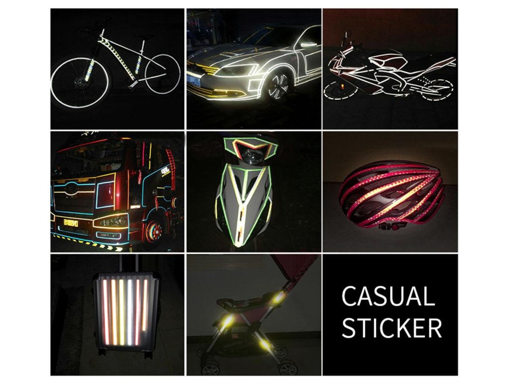 Hosszú fényvisszaverő szalag kerékpárokhoz és egyéb járművekhez. Tökéletes más alkalmazásokhoz is (pl. sötét folyosókon vagy autóbehajtókon). Könnyű telepítés 3M szalaggal. A matrica sötétedés után tökéletesen látható, és jelentősen növeli biztonságunkat az úton.