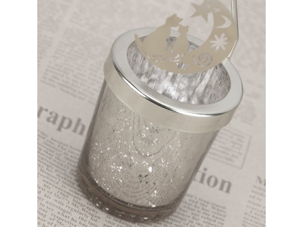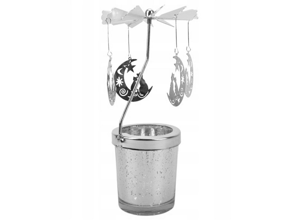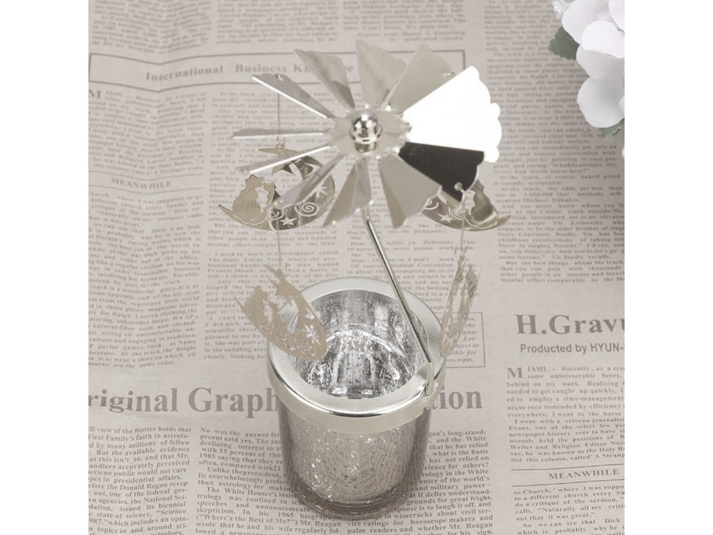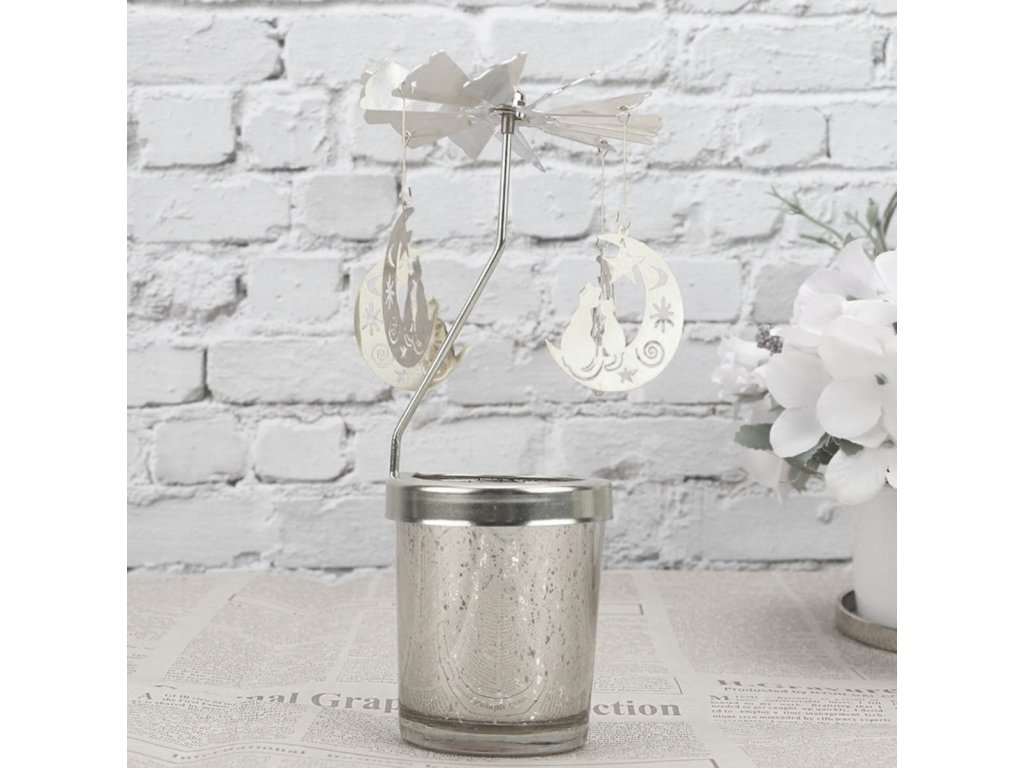 Forgó gyertyatartó edény formájú. 4 hónapig felszerelve egy esztétikus, saját tengelye körül forgó medálon. A díszek a meggyújtott gyertya hője miatt automatikusan forognak. A fényes plakkok visszaverik a gyertyafényt. A gyertyatartó sima felületre helyezésének lehetősége tökéletes dekorációt biztosít az ünnepi időszakra.