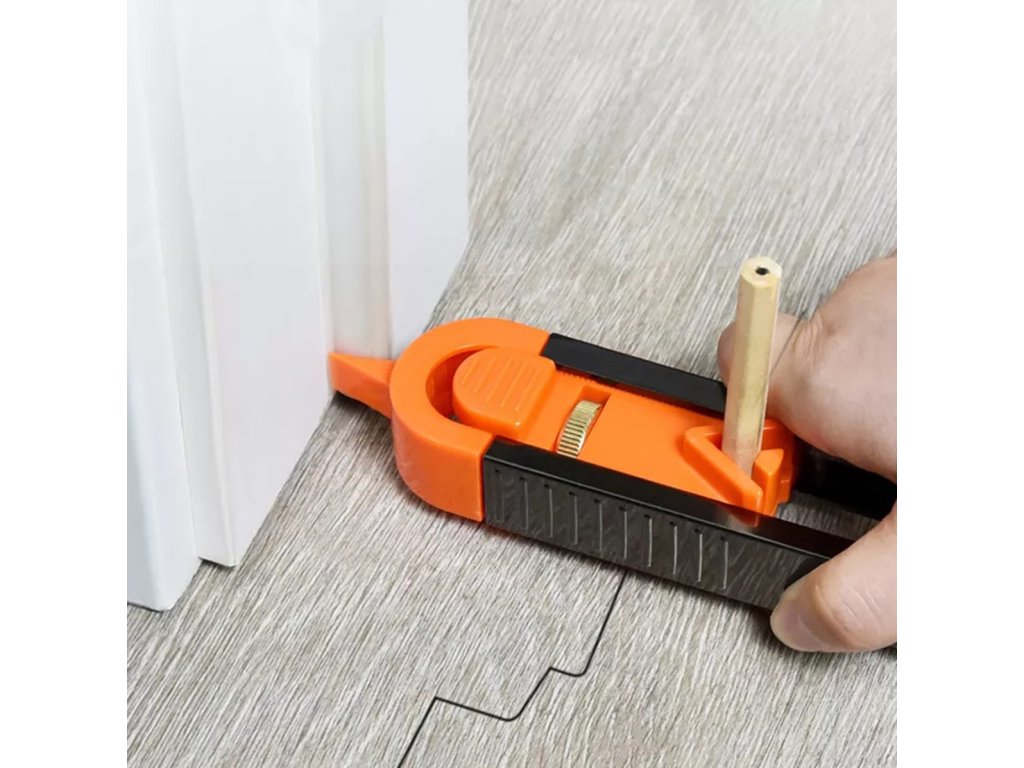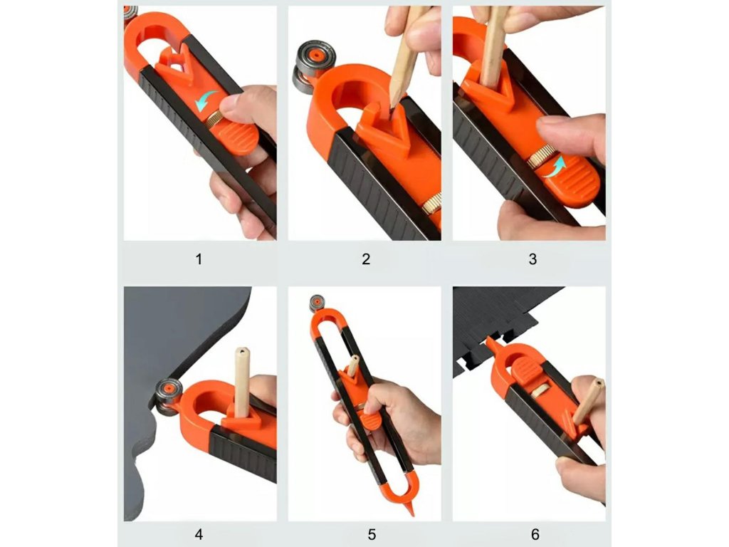 Pontos vonalzó a vonalak követéséhez és jelöléséhez. A kontúrmérő lehetővé teszi a pontos újrarajzolást (beleértve a szabálytalan formákat is) bármilyen felületen. Csak helyezze a ceruzát a lyukba, és állítsa be a kívánt távolságot a vonalak rajzolásához (a termék nem károsítja a felületet).