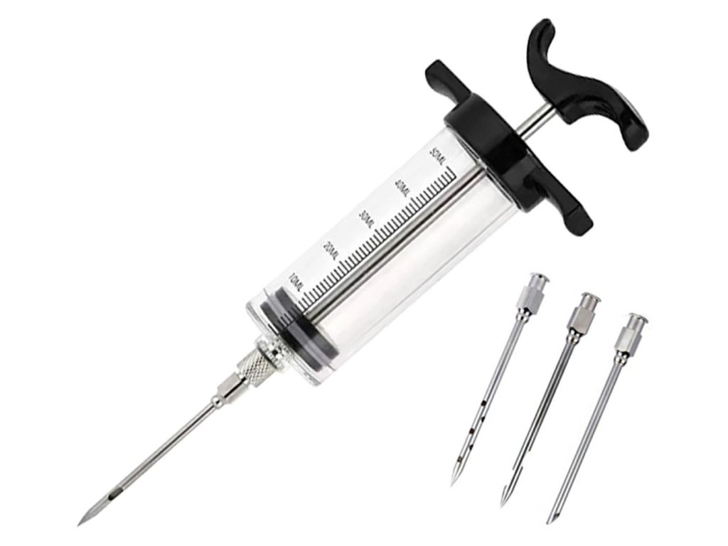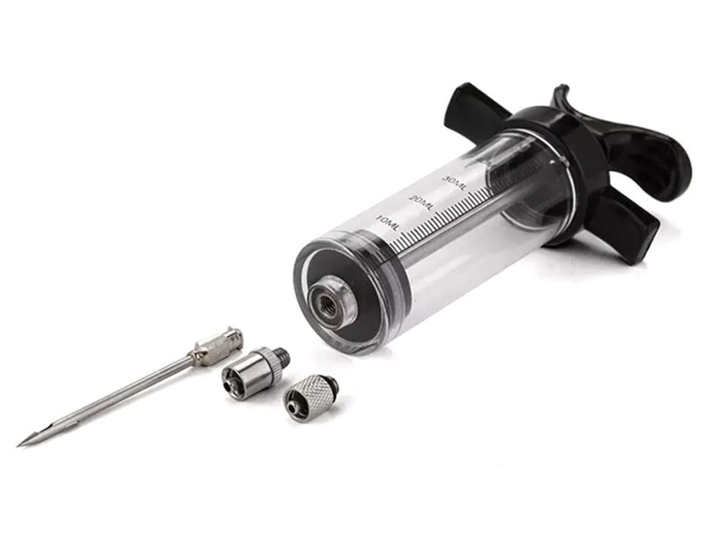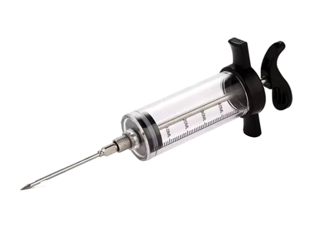 Húsinjektor 50 ml. Kiváló készlet 3 különböző hosszúságú acéltűvel. Lehetővé teszi a hús ízének gyors és kényelmes gazdagítását pác, szósz vagy fűszerek befecskendezésével. Pótolhatatlan eszköz minden konyhában és füstölőben.