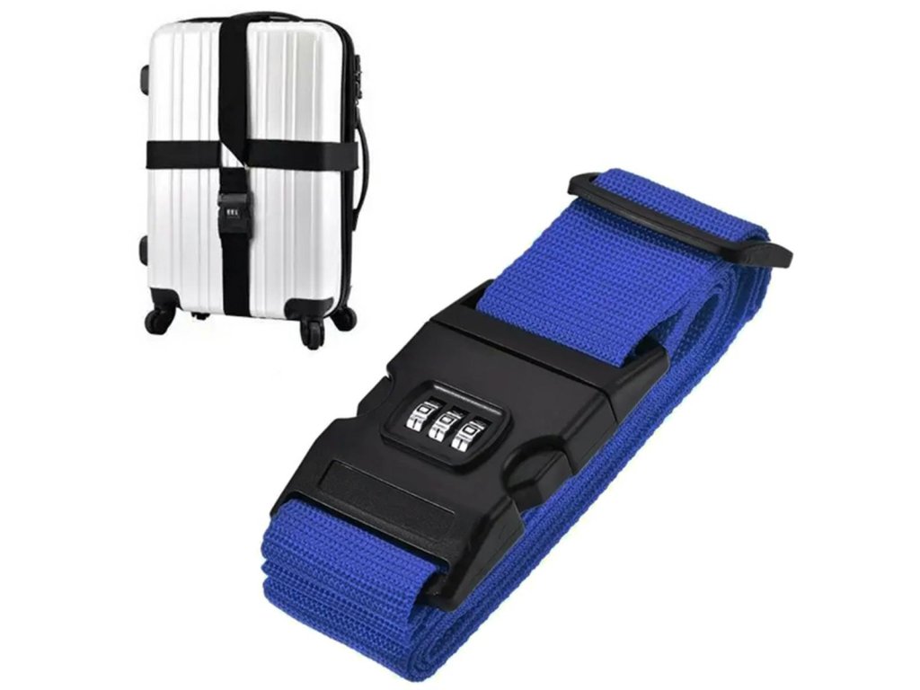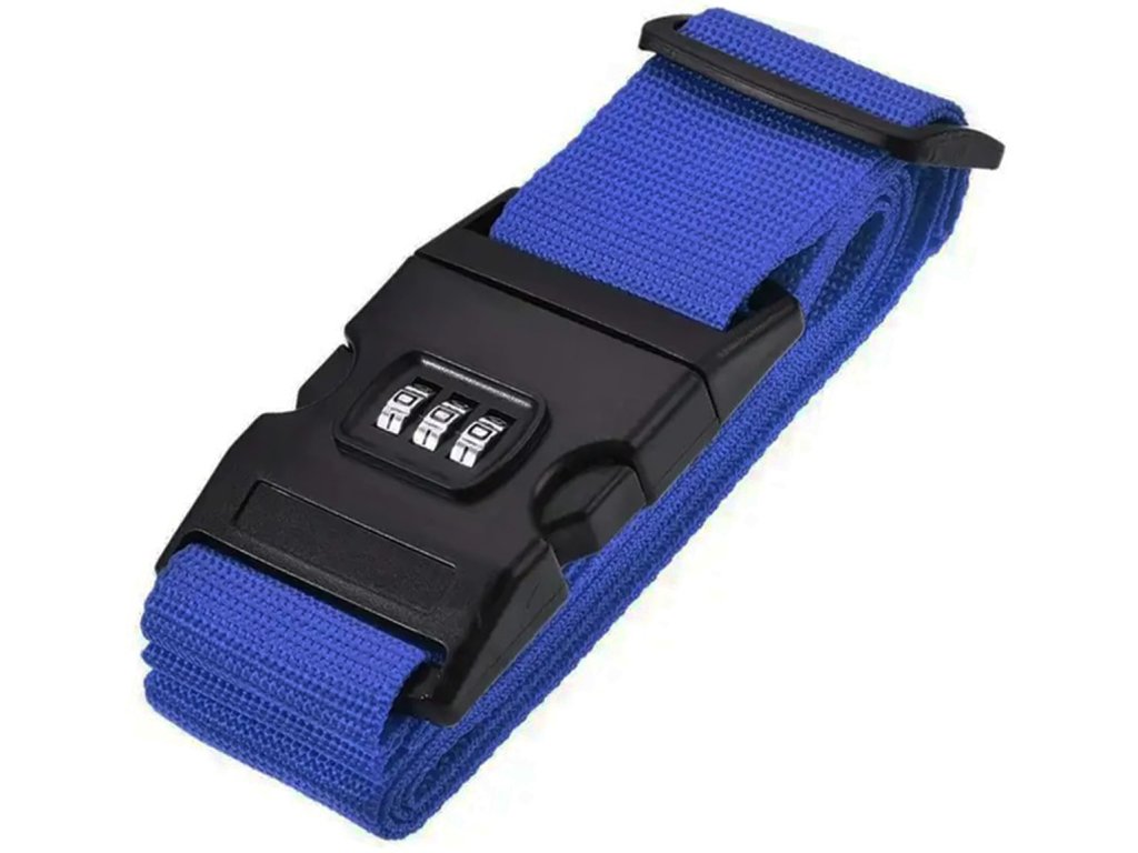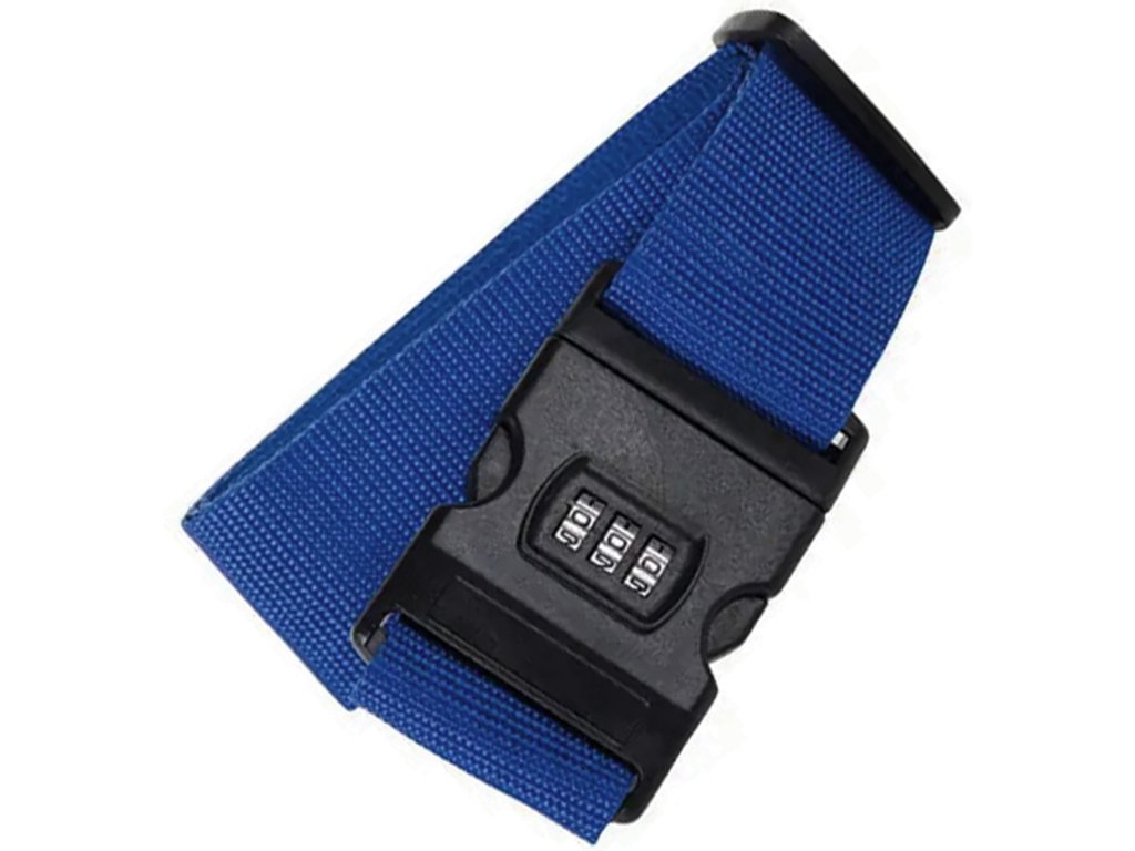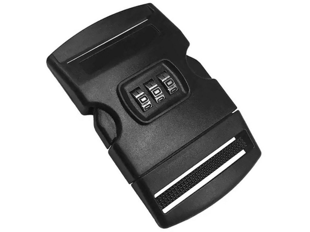 Szíj a csomagok rögzítéséhez. Rögzített csattal, 3 számjegyű biztonsági kóddal. További előny a címcímke adatbeviteli lehetőséggel. Egyszerű működési elv, csak tekerje be a bőröndöt ragasztószalaggal, és állítsa be a kívánt kódot a csat oldalfogainak megnyomásával és a három szám beállításával anélkül, hogy eltávolítaná a kapcsot a csatból.
