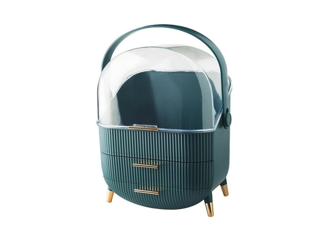 Praktikus és esztétikus rendszerező kozmetikumok tárolására. Egy tágas, átlátszó akrilból készült fő rekesszel és két további fiókkal rendelkezik az apró tárgyak tárolására. Kényelmes és nagyon praktikus fogantyú, amely megkönnyíti a doboz hordozását.