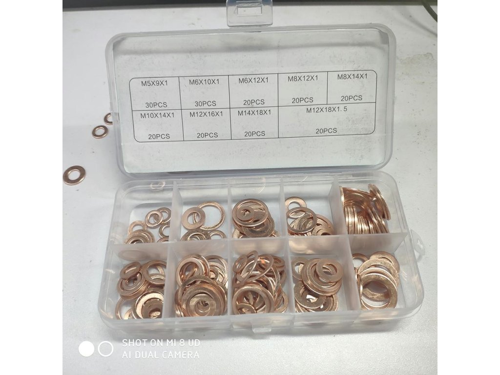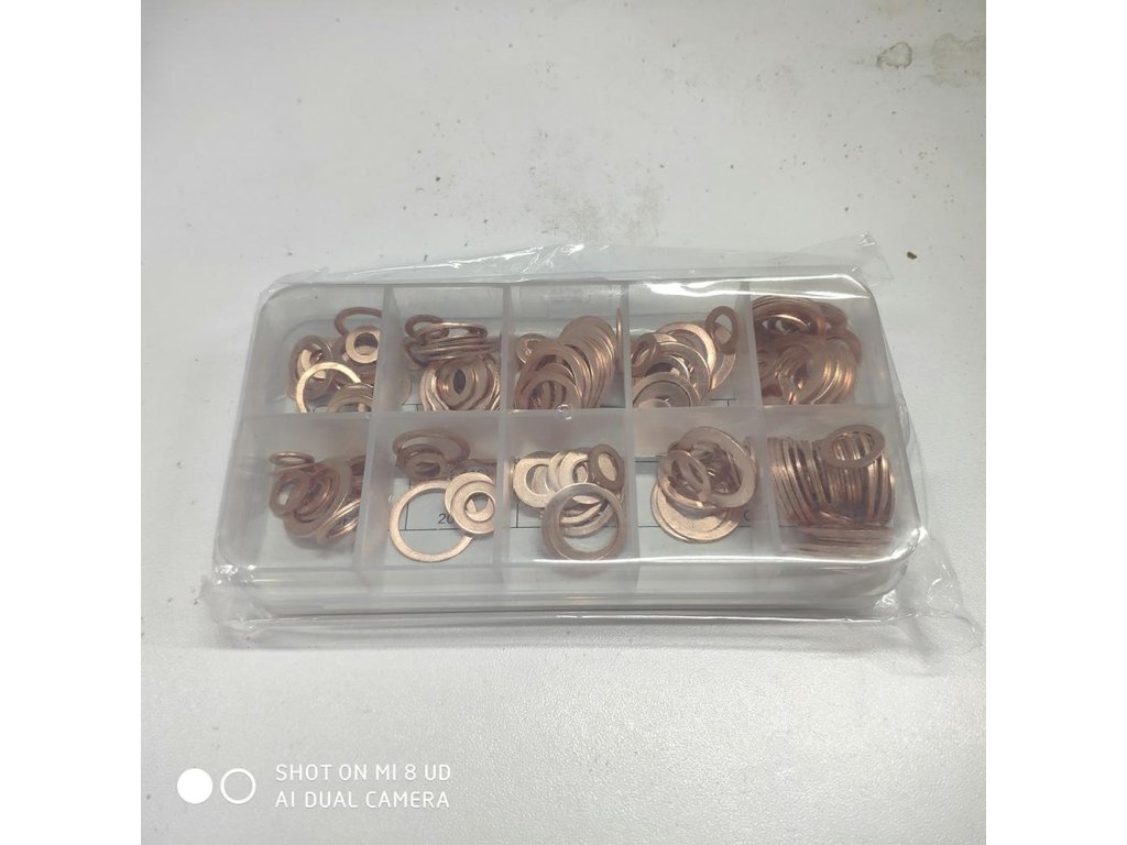 200 db-os rézlapból álló készlet, 9 legnépszerűbb típusra osztva. A párnák jó elektromos és hővezető képességet biztosítanak. Ideális az olajteknő dugójának tömítésére. A készlet tartalmaz egy praktikus tokot rekeszekkel, valamint az egyes betétek leírását.