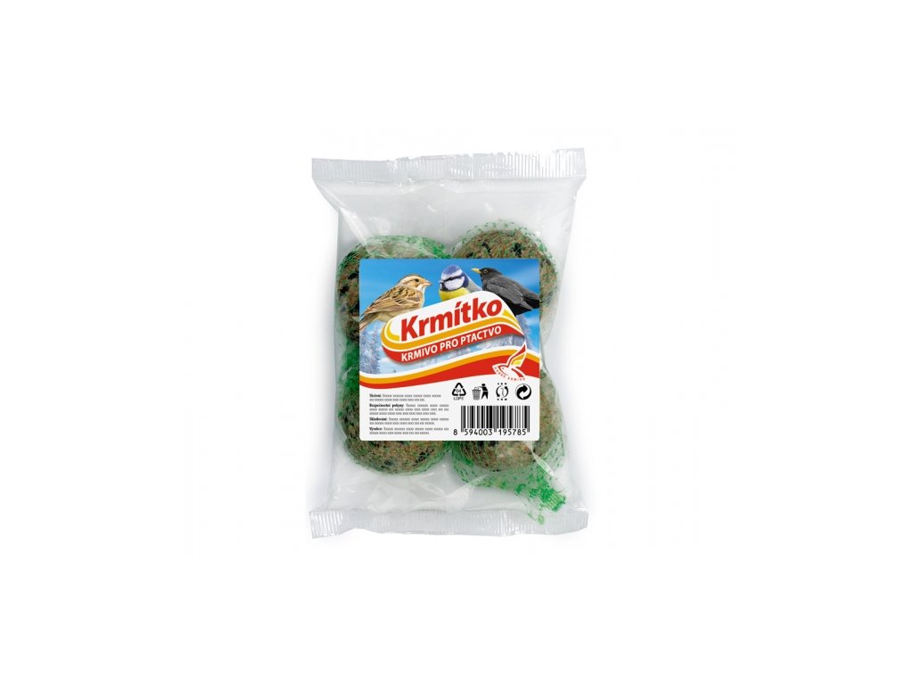 A Krmítko faggyúgolyó a szabadban élő madaraknak kiegészítő takarmányként használható. A nyári hónapokban köretként szolgál, télen pedig táplálékhiányban a madarak takarmányozásának fontos része. A labdát esőtől védett helyre kell helyezni. Hálóban van, ami az etetőbe helyezve kivehető. Búzából, zabból, cirokból, napraforgóból és marhahús zsírból áll. A csomagban 4 db, egyenként 90 grammos faggyúgolyó található.Kiegészítő paraméterek