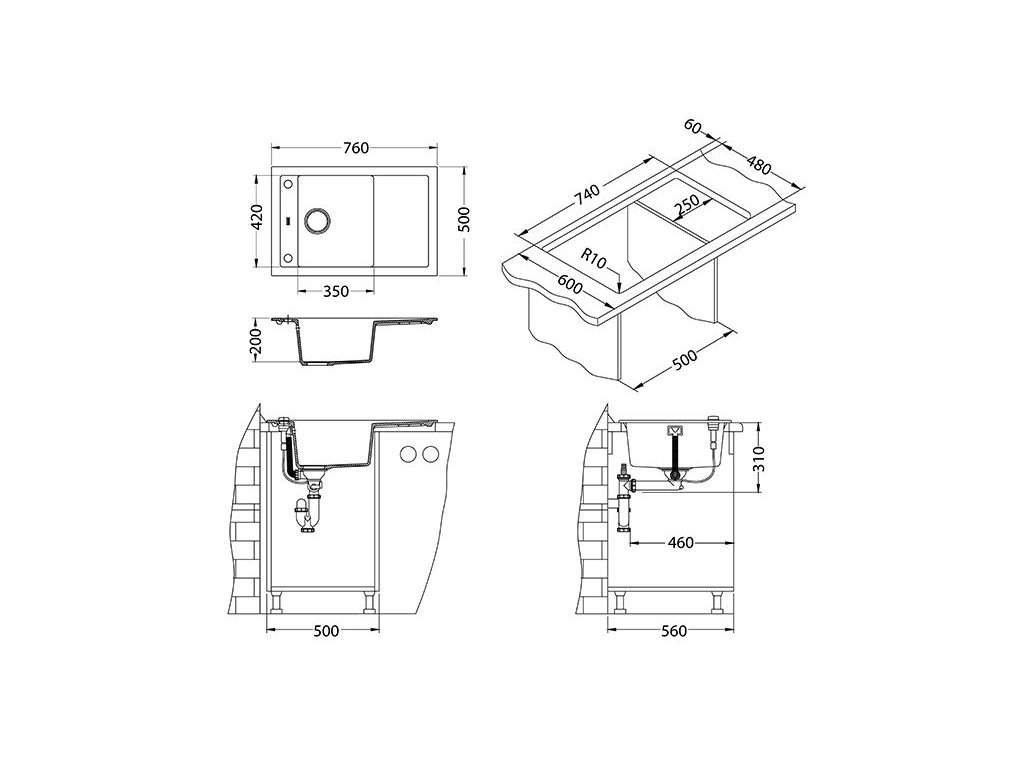 Beépített vagy alászerelt mosogató, univerzális. Kivitel: gránit mosogató Külső méretek: 760x500 mm Tálca méretei: 350x420x200 mm Excenteres szűrőszelep 3 1/2 túlfolyóval, szifon a helytakarékosság érdekében leágazással a mosogatógép számára. Fogantyúk és tömítések a mosogató rögzítéséhez a csomagban Egy furattal a csaphoz Előmart harmadik furat a mosószer-adagolóhoz Szerelési utasítások a csomagon lévő képeken Szerelés szekrénybe szerelési szélesség I: 500 mm U: 800 mm