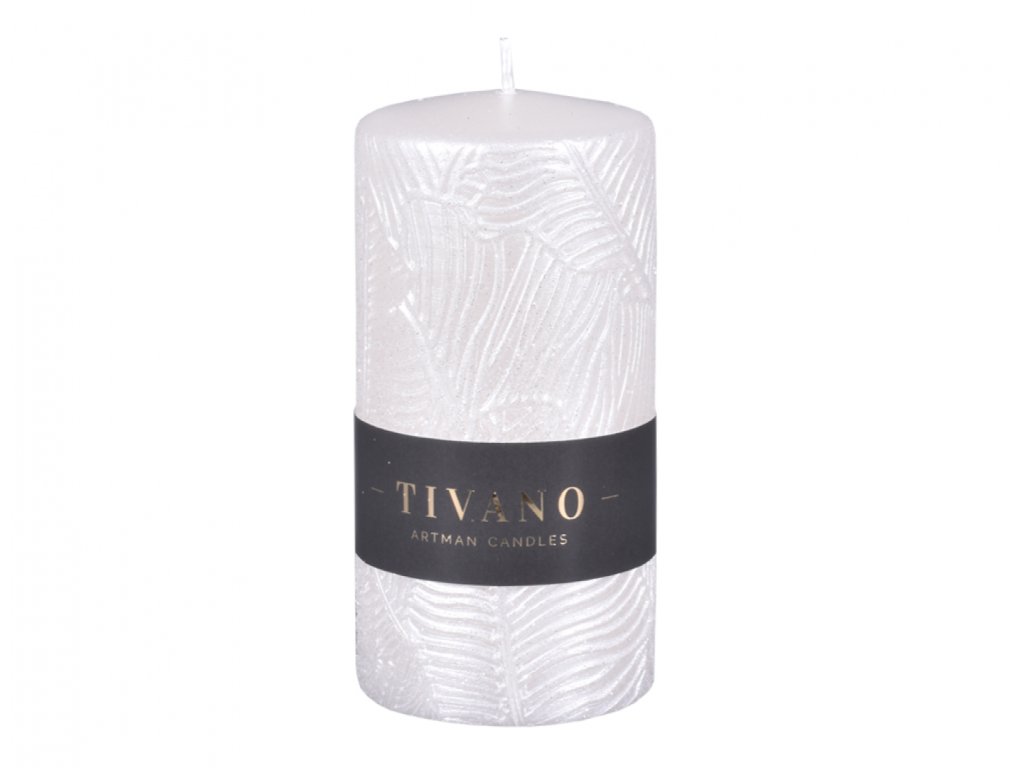 Elegáns megjelenésű, a növényi levelek domborművére emlékeztető, henger alakú gyertya. Szín: fehér. Átmérője: 7 cm, magassága: 14 cm.Kiegészítő paraméterek
