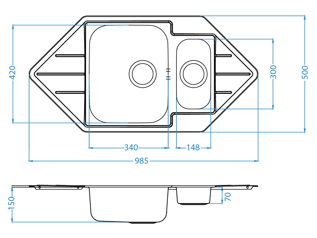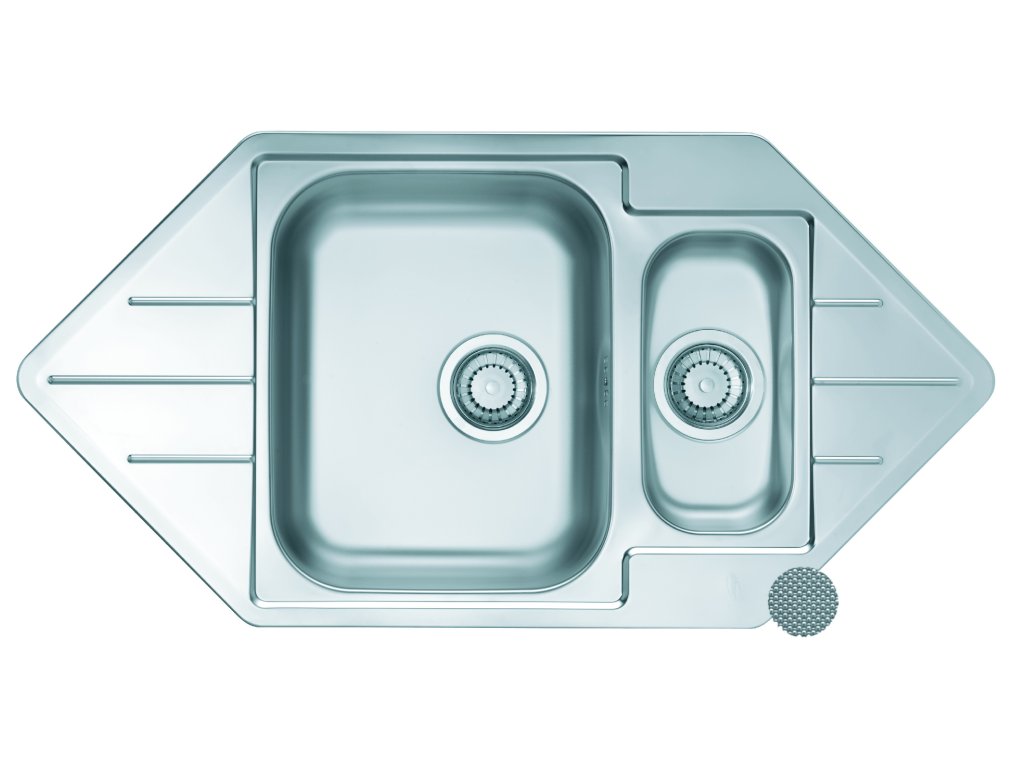 Beépített mosogató, sarok Kivitel: DEK CrNi 18/10 rozsdamentes acélból Külső méretek: 985 x 500 mm Tálca méretei: 340x420x160 mm 148x300x75 mm Lefolyókészlet túlfolyóval és 3 1/2-es szűrővel Fogantyúk a rögzítéshez és tömítések csomag Akkumulátor lyuk nélkül Szerelési útmutató a csomagoláson lévő képeken Beépítés 600 mm széles, 900 mm sarokkal rendelkező szekrénybeKiegészítő paraméterek