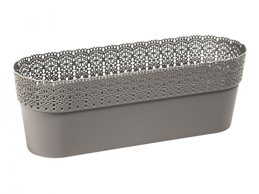 Puha pasztell színű matt műanyag doboz csipke formájú szegéllyel. Alkalmas beltéri és kültéri terekbe. Könnyű műanyagból készült, és ellenáll az UV sugárzásnak. Szín: antracit. Szélesség: 30 cm, magasság: 12 cm.Kiegészítő paraméterek