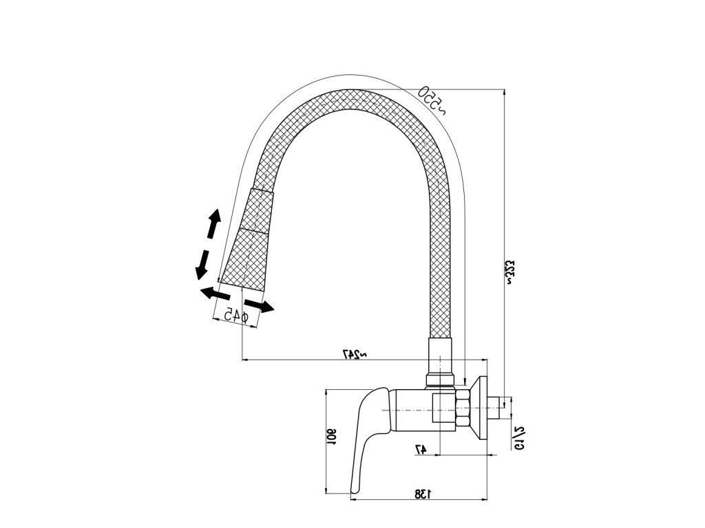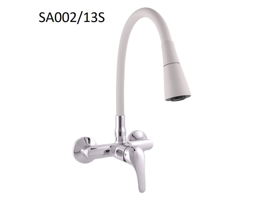Falra szerelhető mosogatócsaptelep rugalmas forgatható fogantyúval, zuhanyzóval.