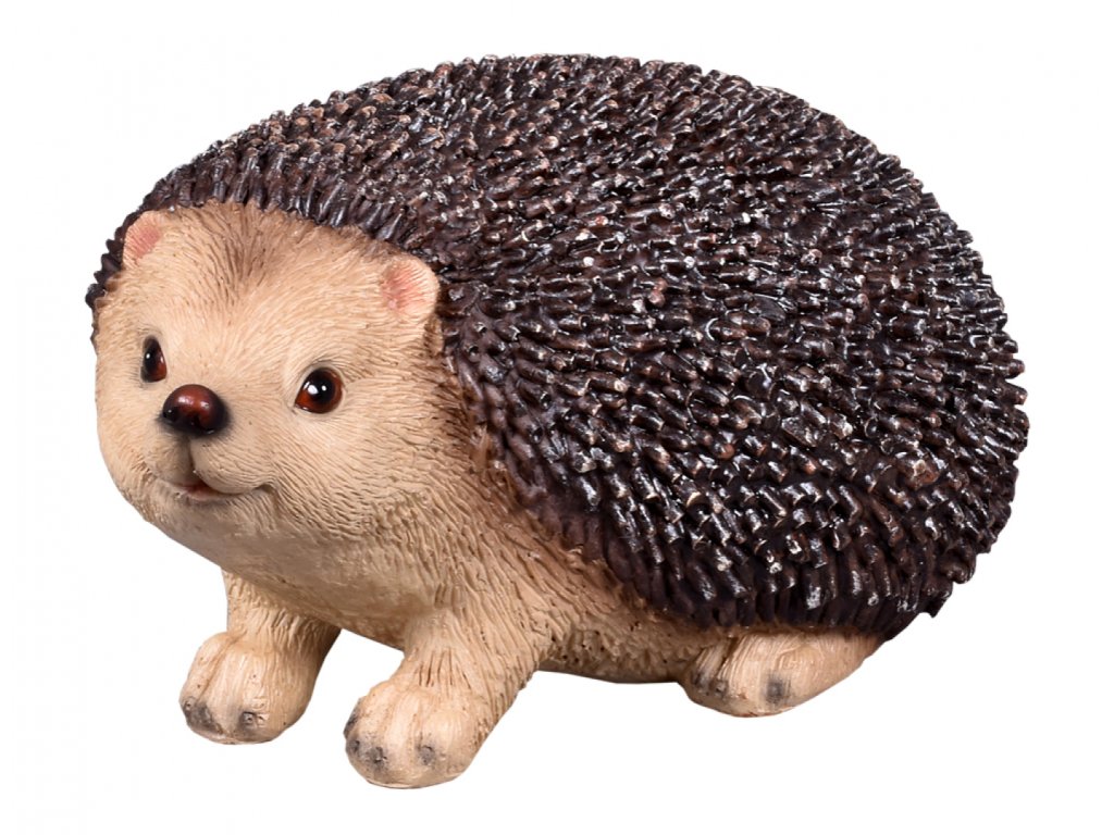 Kerti dekoráció sündisznó formájában. Cementből és polirezinből készült, amely szilárdságot és időjárásállóságot ad a figurának. Méretei: hossza 16 cm, magassága 8 cm, mélysége: 8 cm. Szín: barna, krém.Kiegészítő paraméterek
