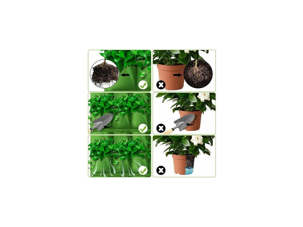 Készítsen gyönyörű virágfalat otthon vagy a kertben a Vertical Grow Bag 4 textil fali ültetővel Ez a függő ültetvény 600 g/m2 súlyú textilből készült. A felhasznált anyag kiváló feltételeket biztosít a növények számára. Biztosítja az optimális légáramlást és a felesleges víz elvezetését. Több virágcserép kombinálása után gyönyörű vízszintes kertet hoz létre különböző virágokból, gyógynövényekből és más kisebb növényekből. Könnyedén felakaszthatod szögekkel vagy csavarokkal (nem része a csomagnak). Műszaki adatok: - anyaga: nem szőtt szövet - tömeg: 600 g/m2 - méret: 66 x 30 cm - 4 zseb (egy zseb 25 x 15 cm) - súly: 160 g - kisebb virágokhoz, fűszernövényekhez - összeszerelési anyag nem a csomag tartalmazzaKiegészítő paraméterek