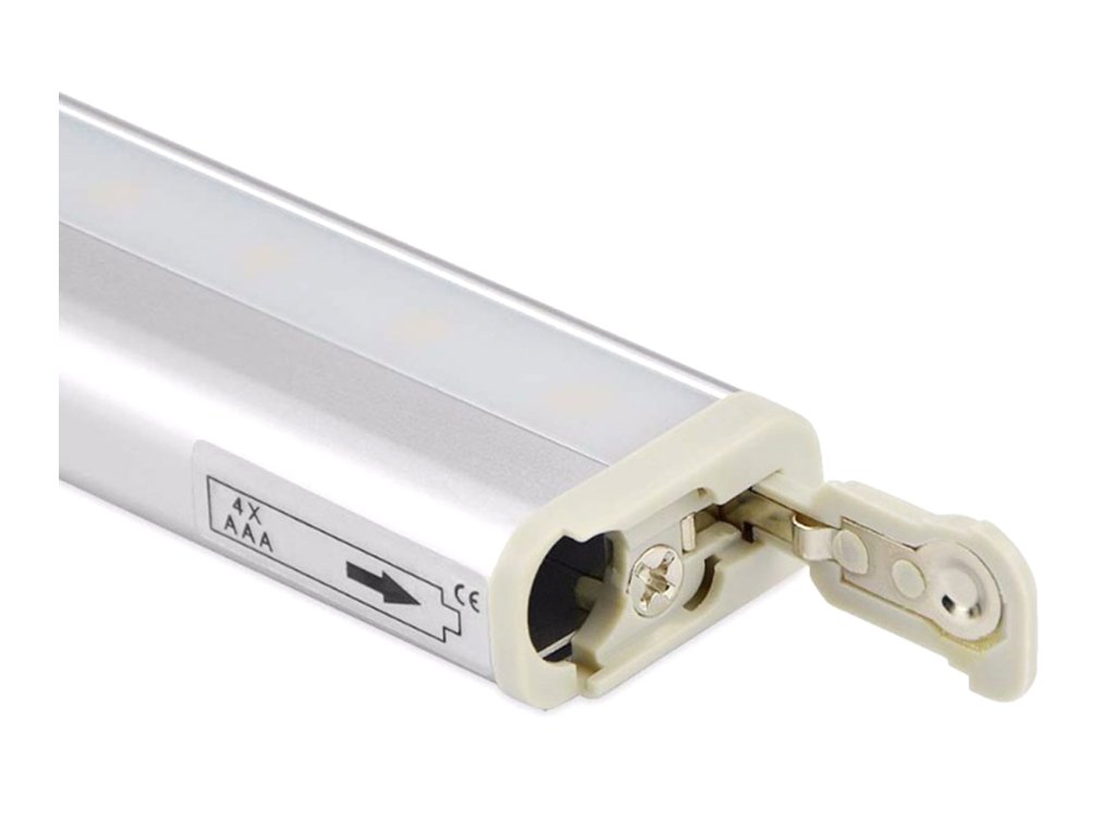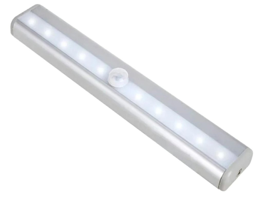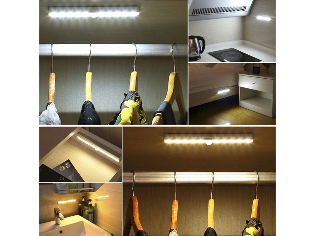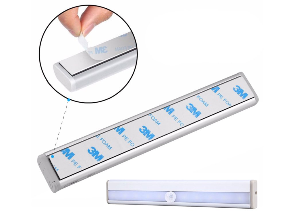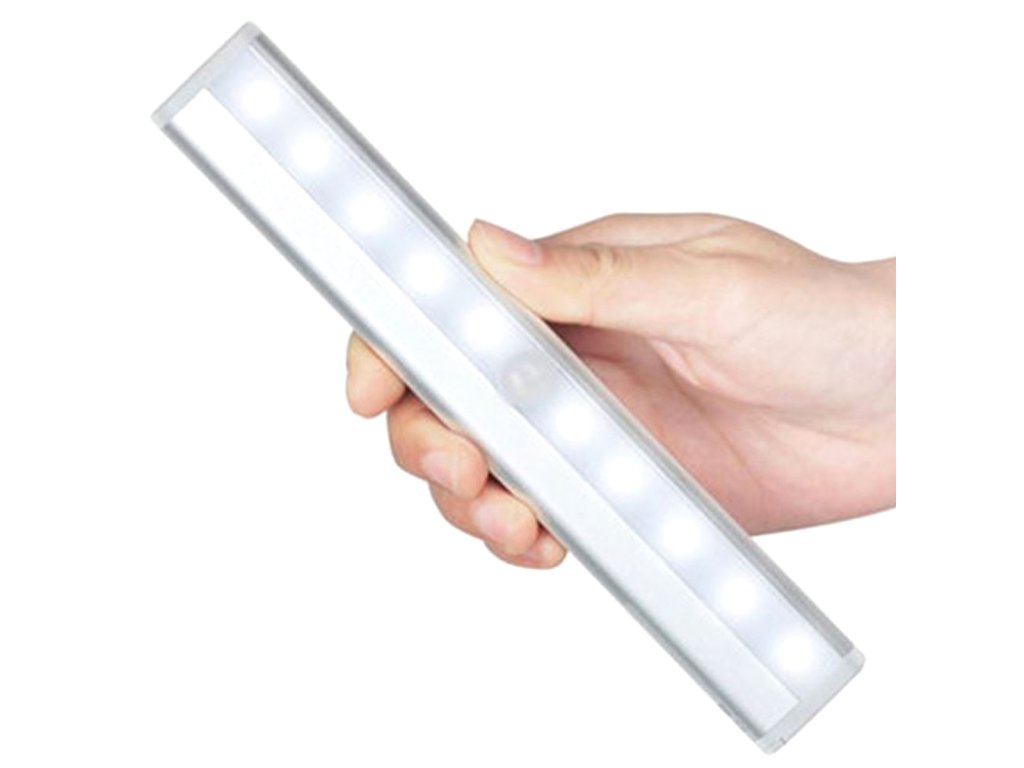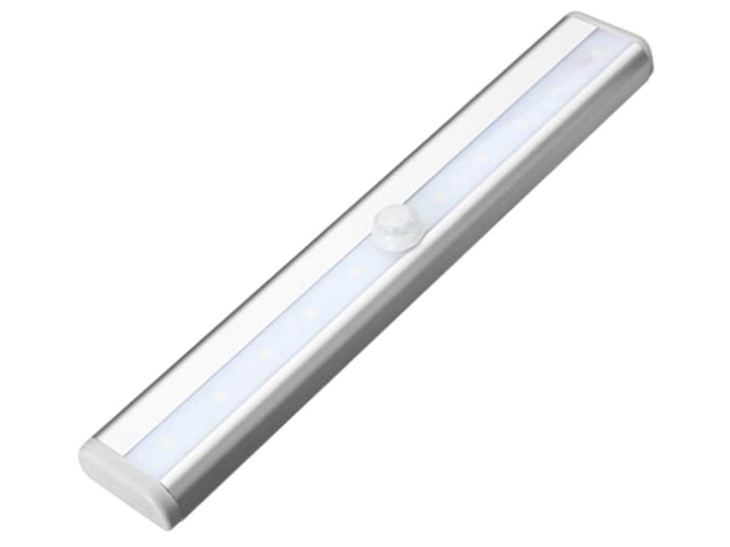 Kompakt LED lámpa 10 LED-del. 4 db 1,5 V-os AAA elemmel működik. A lámpa mozgásérzékelővel van felszerelve (110 fokos szögben működik). Az erős és energiatakarékos világításnak és a vezetékek hiányának köszönhetően a lámpa ideális kiegészítő fényforrás lesz a helyiségben. Kiválóan alkalmas konyhai szekrények alá vagy lépcsőre történő beépítésre - ahol nem lehet kábeleket vezetni, vagy ahol időmegtakarításra és mobilitásra van szükség. Gyors telepítés a 3M kétoldalas szalag használatának köszönhetően.
