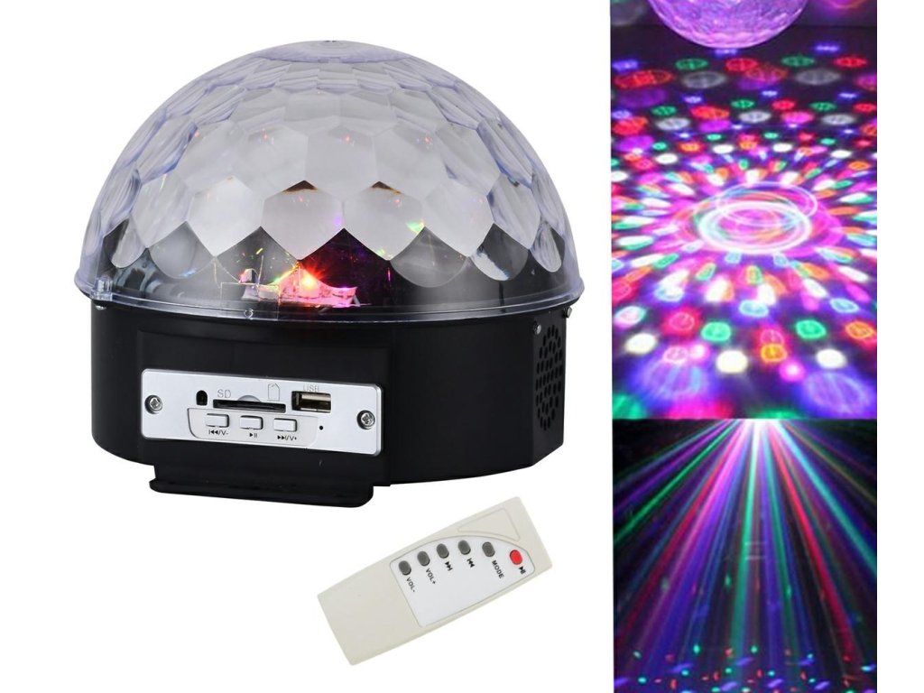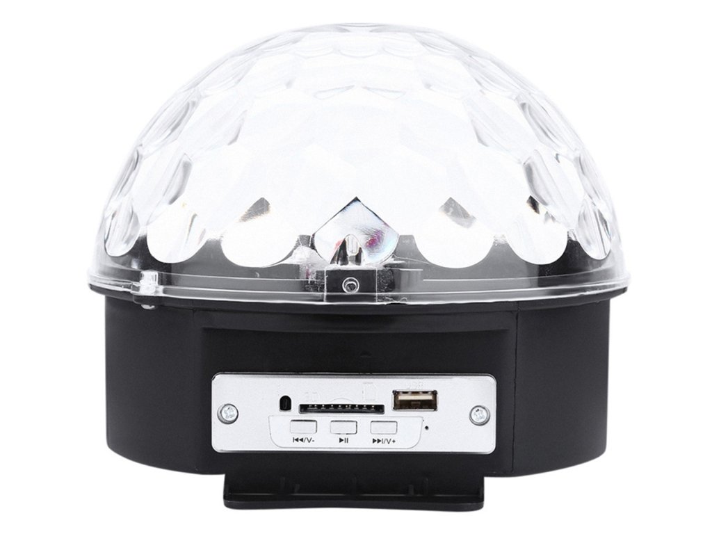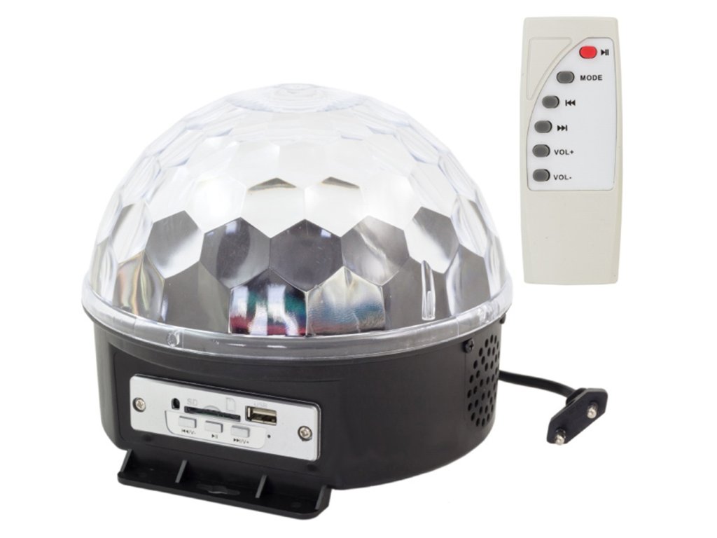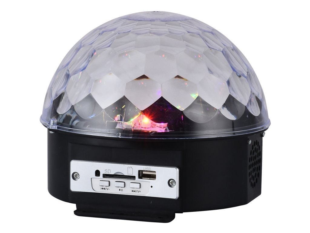 Diszkólabda beépített MP3-lejátszóval, SD-kártyaolvasóval, USB-porttal és kiváló minőségű sztereó hangszórókkal. A készülék vezérlése a panelen található gombokkal vagy a távirányítóval történik.